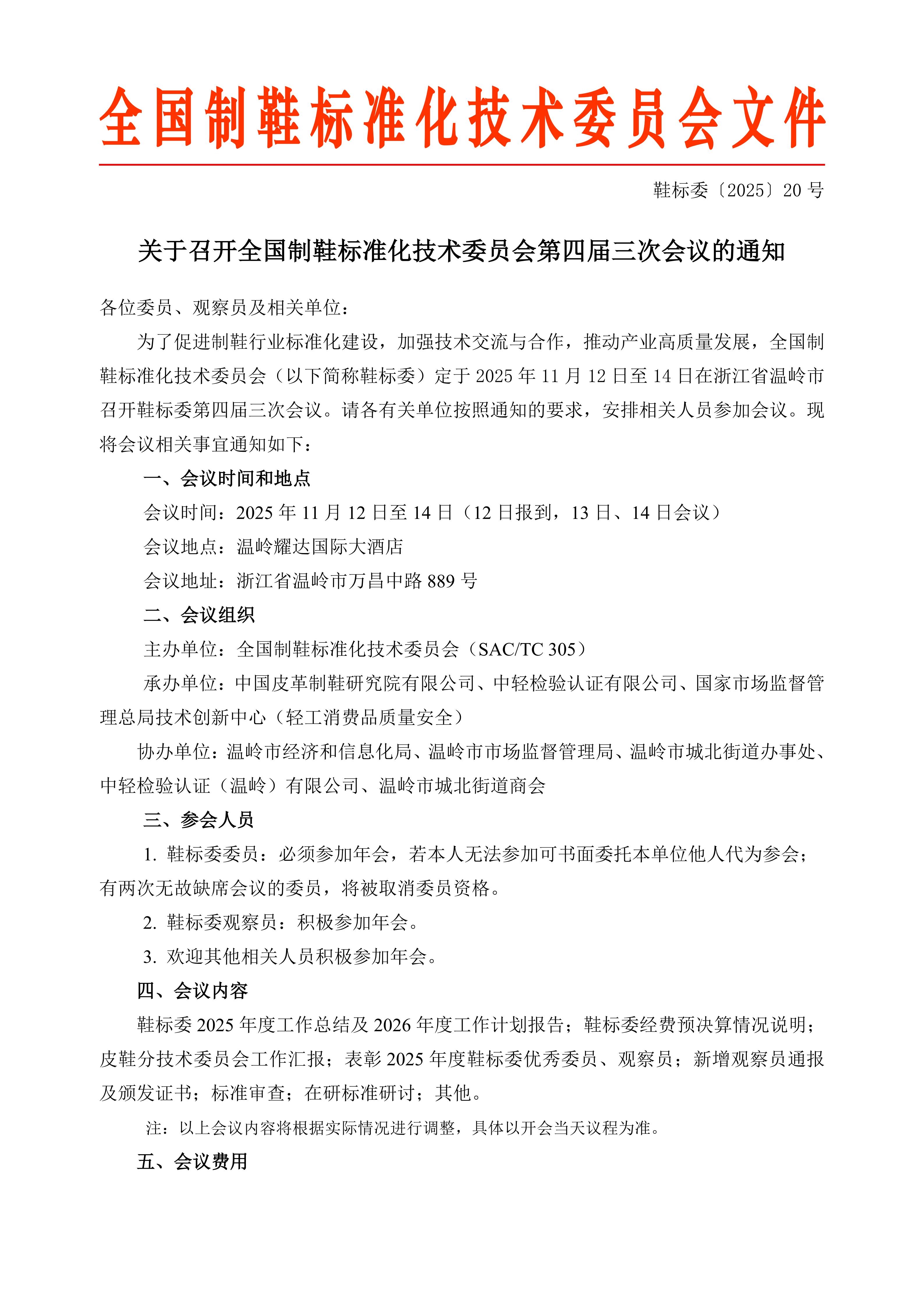 附件:關(guān)于召開全國制鞋標(biāo)準(zhǔn)化技術(shù)委員會第四屆三次會議的通知
