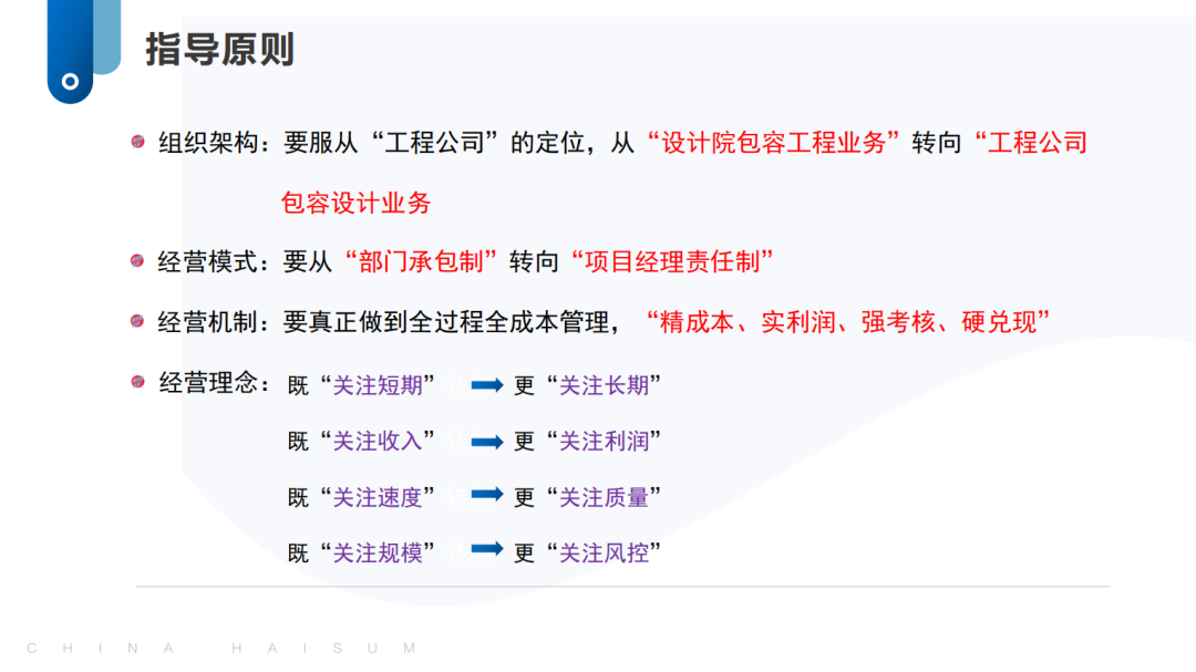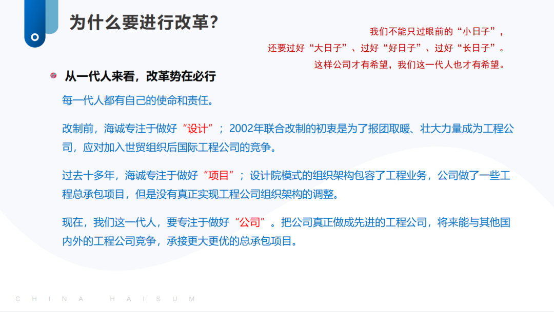 二是要進(jìn)一步提高認(rèn)識(shí),上下一心形成改革合力和發(fā)展動(dòng)力。各級(jí)領(lǐng)導(dǎo)干部要進(jìn)一步提高認(rèn)識(shí),統(tǒng)一思想,融入改革,按照新的組織體系,凝心聚力推進(jìn)公司生產(chǎn)經(jīng)營(yíng)工作。海誠總部要著力抓好統(tǒng)一管理和技術(shù)標(biāo)準(zhǔn)、搭建業(yè)務(wù)支持平臺(tái)、協(xié)調(diào)配置內(nèi)外部資源、優(yōu)化完善考核分配機(jī)制等平臺(tái)性基礎(chǔ)性工作。各子公司、各業(yè)務(wù)單位要進(jìn)一步提高站位,樹立一盤棋思想,積極支持參與配合海誠總部平臺(tái)建設(shè),主動(dòng)承載落實(shí)海誠股份總體戰(zhàn)略。