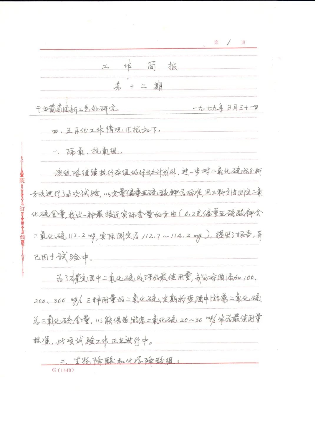 歷史留痕于檔案之上,歲月凝固于檔案之中。在保利中輕中國食品發(fā)酵工業(yè)研究院的檔案管理室,收藏著眾多泛黃的檔案。其中,26期由中國葡萄酒泰斗——郭其昌教授親筆記錄的簡報(bào)尤為珍貴。翻開這一頁頁泛黃的紙張,我們循著歷史的痕跡,揭開了新中國第一瓶干白的誕生記憶。