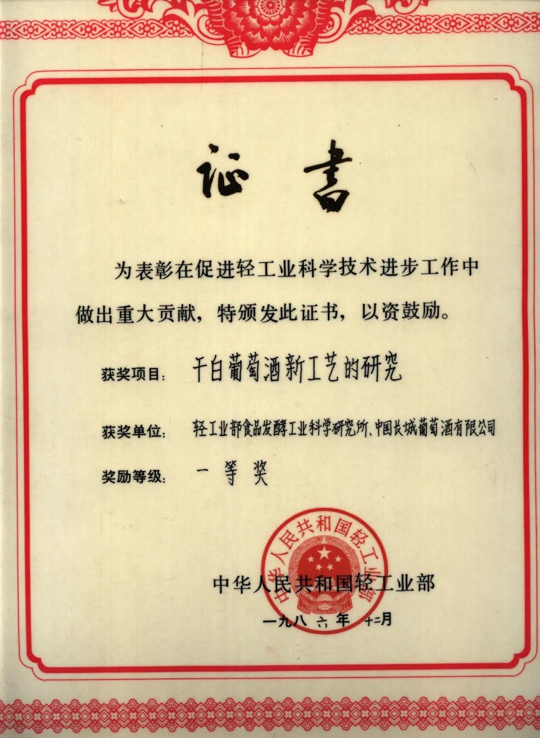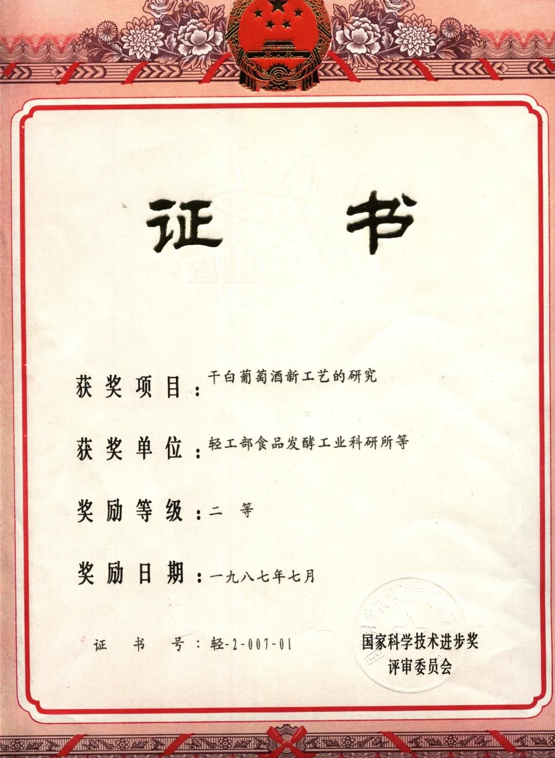1979年,該葡萄酒獲得國家第三屆評酒會金獎(jiǎng)和國家質(zhì)量金獎(jiǎng);1983年在英國倫敦國際第14屆評酒會獲國際銀獎(jiǎng),這是70余年來我國酒類在國際上首次獲獎(jiǎng)。該項(xiàng)目1983年12月通過原輕工部科技局組織的技術(shù)鑒定,成果達(dá)到國際先進(jìn)水平,1987年榮獲國家科技進(jìn)步二等獎(jiǎng)。“中國第一瓶干白”的研制成功,不僅為國家培養(yǎng)了大批的專業(yè)技術(shù)人才,也為我國葡萄酒工業(yè)的發(fā)展壯大奠定了良好的基礎(chǔ)。