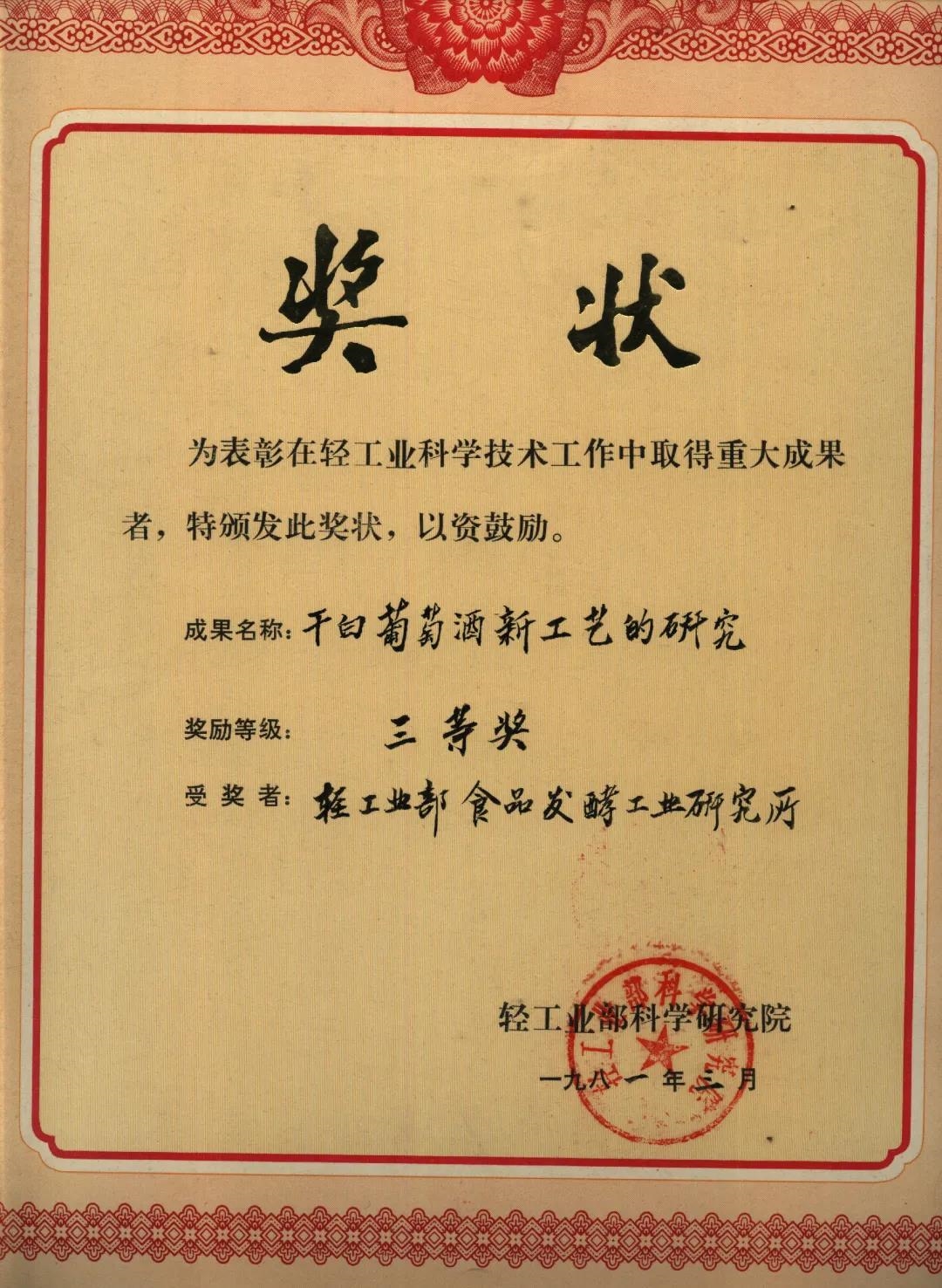 1978年8月-1983年1月,歷時(shí)6年時(shí)間,研究團(tuán)隊(duì)對干白葡萄酒的釀酒原料、釀造工藝和設(shè)備進(jìn)行了深入的研發(fā),終于提出了優(yōu)質(zhì)干白葡萄酒釀造工藝的規(guī)格和特點(diǎn),在河北沙城首創(chuàng)出“中國第一瓶干白”。