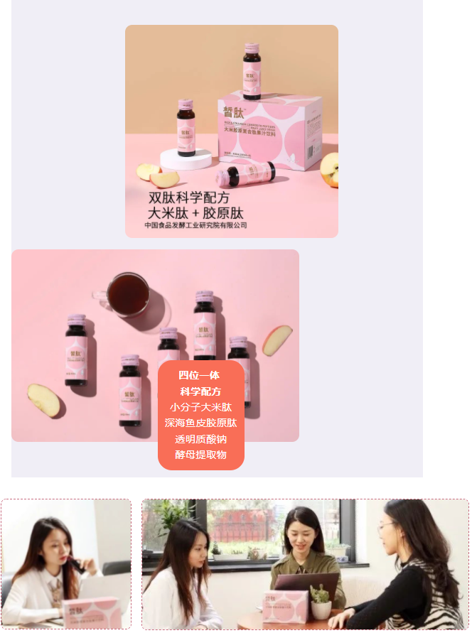 “皙肽”系列產(chǎn)品由保利中輕所屬中國食品研究院自主研發(fā)生產(chǎn),大米膠原復(fù)合肽果汁飲料以大米肽和自有專利提取的深海魚皮膠原肽為核心原料,雙肽科學(xué)配方,解決肌膚暗沉、干燥粗糙、彈性降低等肌膚問題,經(jīng)過專業(yè)檢測認(rèn)證,安全放心;中國食品研究院專家團(tuán)隊(duì)匠心研發(fā),經(jīng)過長期追蹤試飲反饋,肌膚問題明顯改善。