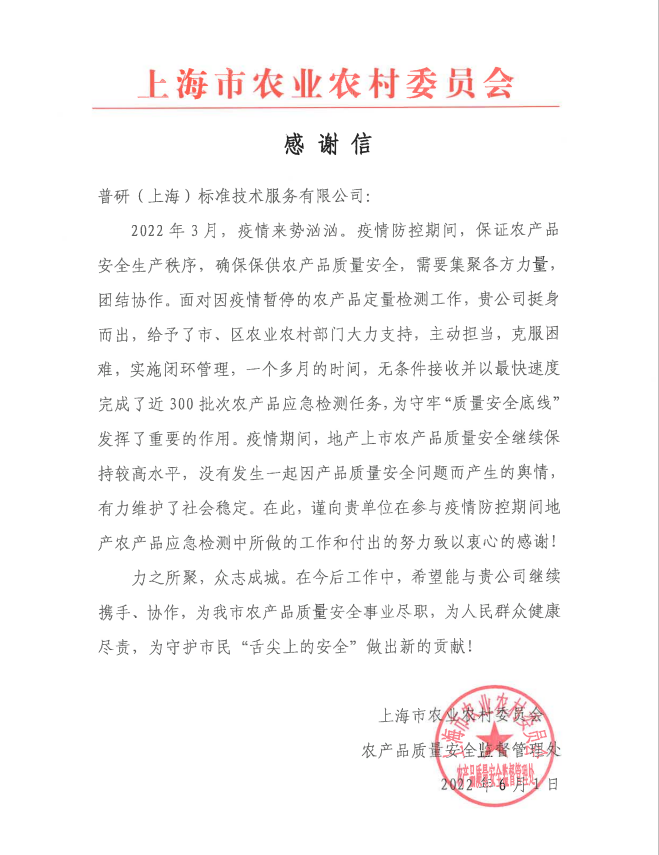 “面對(duì)因疫情暫停的農(nóng)產(chǎn)品定量檢測(cè)工作,貴公司挺身而出,給予了市、區(qū)農(nóng)業(yè)農(nóng)村部門大力支持......” 6月1日,保利中輕所屬中輕檢驗(yàn)認(rèn)證有限公司(以下簡(jiǎn)稱“中輕檢驗(yàn)”)普研(上海)標(biāo)準(zhǔn)技術(shù)服務(wù)有限公司(以下簡(jiǎn)稱“普研標(biāo)準(zhǔn)”)收到一封來(lái)自上海市農(nóng)業(yè)農(nóng)村委員會(huì)發(fā)來(lái)的感謝信。信中對(duì)中輕檢驗(yàn)普研標(biāo)準(zhǔn)參與上海疫情防控期間農(nóng)產(chǎn)品應(yīng)急檢測(cè)所做的工作和付出的努力致以衷心的感謝。