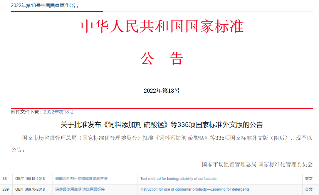 中國日用化學(xué)研究院制修訂的《手洗餐具用洗滌劑》《衛(wèi)生潔具清洗劑》等11項國家標(biāo)準(zhǔn)及《表面活性劑生物降解度試驗方法》《消費品使用說明 洗滌用品標(biāo)簽》2項國家標(biāo)準(zhǔn)外文版獲批發(fā)布。
