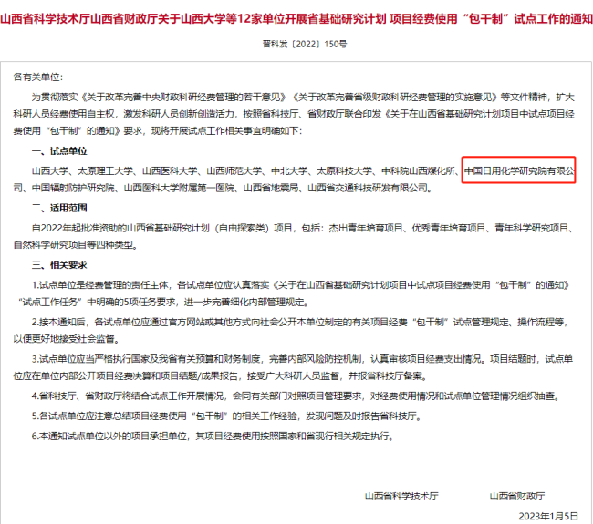 中國日用化學(xué)研究院獲批成為山西省基礎(chǔ)研究計劃項目經(jīng)費使用“包干制”試點單位 。中國日用化學(xué)研究院將以此為契機(jī),加大科研投入,激發(fā)科研人員創(chuàng)造活力,不斷提升創(chuàng)新能力。