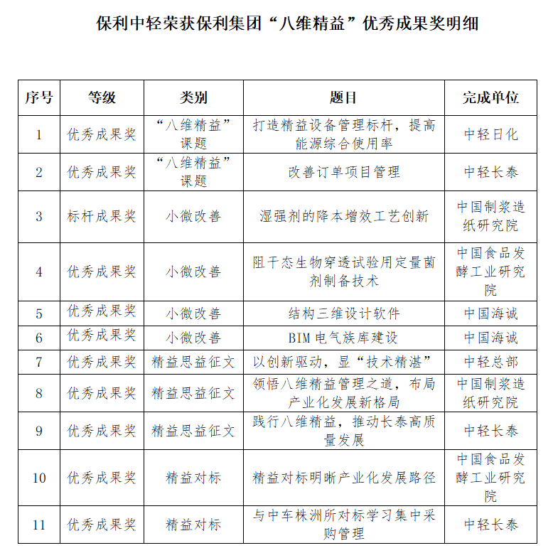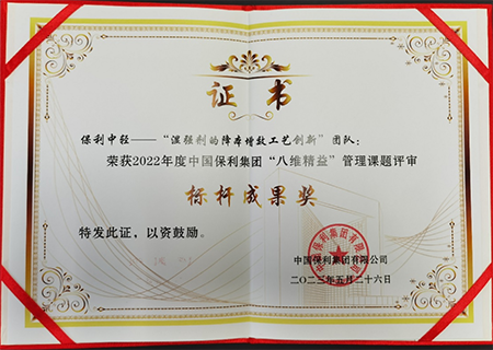 會(huì)議期間,舉行了“八維精益”優(yōu)秀成果頒獎(jiǎng)典禮。保利集團(tuán)從2022年“八維精益”各項(xiàng)工作成果中評選出83項(xiàng)優(yōu)秀成果獎(jiǎng),其中標(biāo)桿成果獎(jiǎng)6項(xiàng)。保利中輕榮獲標(biāo)桿成果獎(jiǎng)1項(xiàng)、優(yōu)秀成果獎(jiǎng)10項(xiàng),其中,“濕強(qiáng)劑的降本增效工藝創(chuàng)新”課題獲得標(biāo)桿成果獎(jiǎng)。該課題團(tuán)隊(duì)通過不斷優(yōu)化濕強(qiáng)劑生產(chǎn)技術(shù)方案,成功研制出低成本高質(zhì)量生產(chǎn)技術(shù),提升了產(chǎn)品市場份額和競爭力,實(shí)現(xiàn)客戶成本降低15%。
