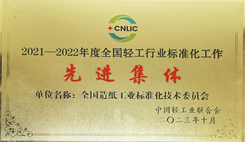 中國(guó)制漿造紙研究院榮獲“2021-2022年度全國(guó)輕工行業(yè)標(biāo)準(zhǔn)化工作先進(jìn)單位”稱號(hào);作為秘書(shū)處承擔(dān)單位運(yùn)營(yíng)的全國(guó)造紙工業(yè)標(biāo)準(zhǔn)化委員會(huì)榮獲“2021—2022年度全國(guó)輕工行業(yè)標(biāo)準(zhǔn)化工作先進(jìn)集體”稱號(hào)。