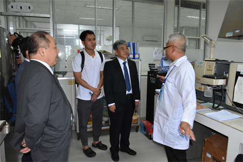 曹春昱一行首先來到柬埔寨國家科學(xué)技術(shù)創(chuàng)新實(shí)驗(yàn)室(STINL),參觀水化學(xué)檢測(cè)室、重金屬元素分析室、果汁及啤酒中試車間等實(shí)驗(yàn)室場所,詳細(xì)了解“一帶一路”聯(lián)合實(shí)驗(yàn)室運(yùn)行情況及此前中方援助設(shè)備使用情況。