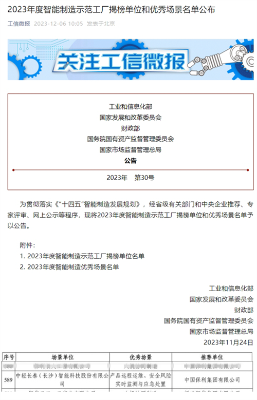 近日,工業(yè)和信息化部公布“2023年度智能制造示范工廠揭榜單位和優(yōu)秀場景名單”。保利中輕所屬中輕長泰研發(fā)的“產品遠程運維”和“安全風險實時監(jiān)測與應急處置”成功入選智能制造優(yōu)秀場景名單,凸顯中輕長泰在智能制造領域的顯著成績。
