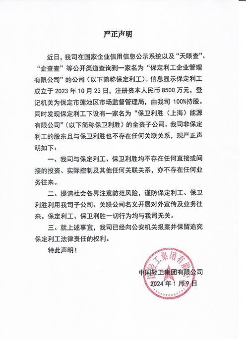 近日,我司在國(guó)家企業(yè)信用信息公示系統(tǒng)以及“天眼查”、“企查查”等公開渠道查詢到一家名為“保定利工企業(yè)管理有限公司”的公司(以下簡(jiǎn)稱保定利工)。信息顯示保定利工成立于2023年10月23日,注冊(cè)資本人民幣8500萬元,登記機(jī)關(guān)為保定市蓮池區(qū)市場(chǎng)監(jiān)督管理局,由我司100%持股。同時(shí)發(fā)現(xiàn)保定利工下設(shè)有一家名為“保衛(wèi)利勝(上海)能源有限公司”(以下簡(jiǎn)稱保衛(wèi)利勝)的全資子公司。我司非保定利工的股東且與保衛(wèi)利勝也不存在任何關(guān)聯(lián)關(guān)系,現(xiàn)嚴(yán)正聲明如下: