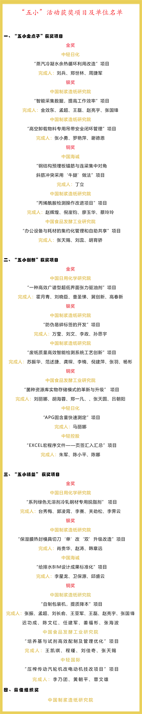 2023年,保利中輕各級工會積極組織,廣大員工踴躍參加,共征集各類創(chuàng)新成果45項(xiàng),涵蓋產(chǎn)品研發(fā)、施工工藝、精益管理等多個領(lǐng)域。保利中輕工會經(jīng)過初選和現(xiàn)場答辯,評選出“五小金點(diǎn)子”“五小創(chuàng)新”“五小精益”三個類別中的金獎、銀獎和銅獎18個獎項(xiàng),最佳組織獎1個獎項(xiàng)。