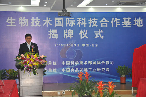 揭牌儀式上,靳曉明司長(zhǎng)和陳鄂生董事長(zhǎng)分別致辭。靳司長(zhǎng)指出,科技的靈魂在于開(kāi)放,食品行業(yè)作為國(guó)民經(jīng)濟(jì)的重要支柱產(chǎn)業(yè),技術(shù)的進(jìn)步離不開(kāi)國(guó)際合作。希望以設(shè)立生物技術(shù)“國(guó)際科技合作基地”為契機(jī),積極參加國(guó)際科技合作交流活動(dòng),充分利用國(guó)際資源,進(jìn)一步挖掘潛力,引進(jìn)高級(jí)人才,使基地真正成為“技術(shù)領(lǐng)先、人才聚集”的國(guó)際科技創(chuàng)新中心。陳董事長(zhǎng)要求,食品發(fā)酵院要深刻領(lǐng)會(huì)科技部《“十一五”國(guó)際合作規(guī)劃綱要》精神,緊密?chē)@建設(shè)創(chuàng)新型國(guó)家的總體目標(biāo),切實(shí)提高自主創(chuàng)新能力,建設(shè)“項(xiàng)目基地人才”一體化的國(guó)際科技研發(fā)高地。蔡院長(zhǎng)代表基地建設(shè)單位發(fā)表講話。