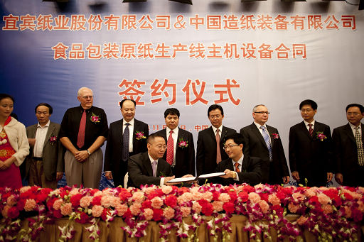 1128上午,集團(tuán)公司董事長(zhǎng)陳鄂生、副總經(jīng)理馬思一出席了在成都舉行的宜賓紙業(yè)股份有限公司與中國(guó)造紙裝備有限公司食品包裝原紙生產(chǎn)線主機(jī)設(shè)備合同簽約儀式。