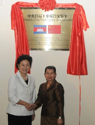 2012年12月7日,國務(wù)委員劉延?xùn)|與柬埔寨王國副首相梅森安在柬埔寨首都金邊共同為“中柬食品工業(yè)聯(lián)合實(shí)驗(yàn)室”揭牌。教育部部長袁貴仁、科技部黨組書記王志剛、國務(wù)院副秘書長江小涓、外交部副部長宋濤及柬埔寨國務(wù)委員會、工業(yè)礦產(chǎn)及能源部、教育部、外交部等部門高級官員出席揭牌儀式。集團(tuán)公司陳鄂生董事長出席儀式并陪同兩國領(lǐng)導(dǎo)人參觀了實(shí)驗(yàn)室。集團(tuán)公司所屬中國食品發(fā)酵工業(yè)研究院院長蔡木易、中國海誠股份南寧公司董事長王毅軍等中柬雙方項(xiàng)目執(zhí)行人員參加了典禮。